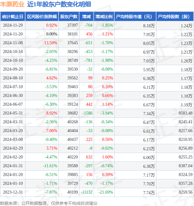 从股价来看,2024年11月20日至2024年11月29日,丰原药业区间涨幅为0.92%,在此期间股东户数减少704.0户,减幅为1.85%。