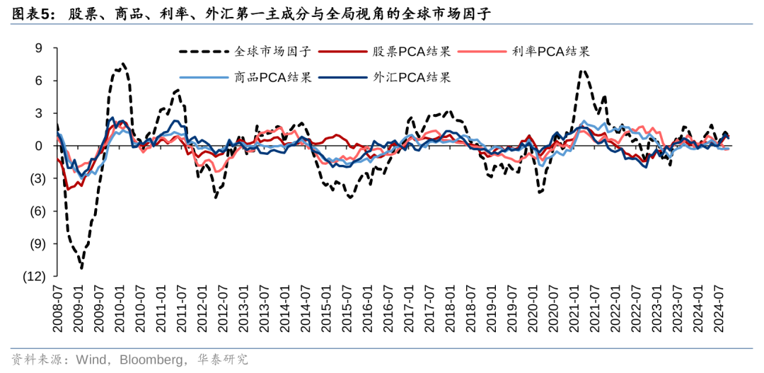 首先,我们选取具有代表性的全球股票、商品、利率、外汇。选取的原则是尽可能对发达市场经济体和新兴市场经济体、欧美地区经济体和亚太地区经济体覆盖全面。然后,计算股票、商品、外汇资产的月末同比收益率序列和利率的同比差分序列。接着,对四大类资产分别开展PCA,取其第一主成分,其中利率和外汇的第一主成分需乘以-1,使其走势与股票、商品第一主成分的走势方向一致。不难发现,全球股票、商品、利率、外汇的第一主成分走势高度相关,且具有周期性波动,这说明全球资本市场受到统一的市场因子的驱动。因此,我们对四大类资产第一主成分zscore标准化后等权相加得到全球市场因子。