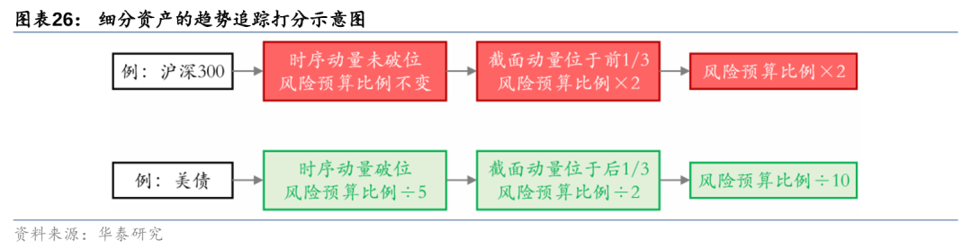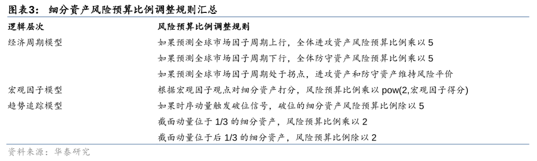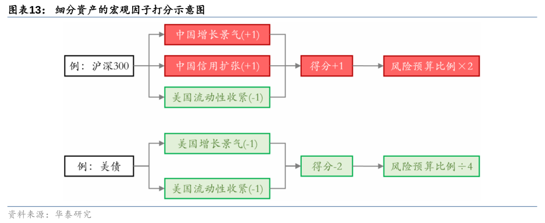 根据宏观因子与细分资产的映射关系,我们可以对各资产进行打分。当宏观因子观点利好该资产时,加1分;当宏观因子观点利空该资产时,减1分;宏观因子无法给出明确观点或者和资产之间不存在映射关系时,得分不变。最终,我们将根据细分资产的宏观因子得分,将风险预算比例乘以pow(2,宏观因子得分)。