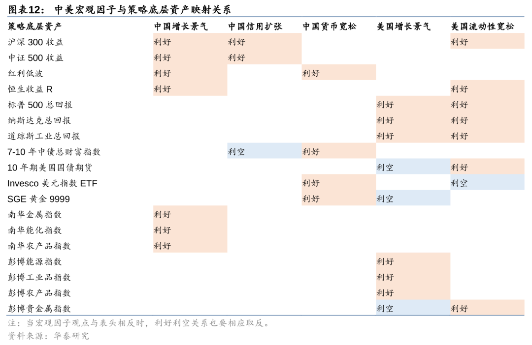 在前期报告《宏观因子指数回顾、改进与应用》(2022-02-14)和《海外增长-流动性框架与大类资产配置》(2023-01-17)中,我们从资产定价模型出发,构建了以增长-流动性为核心的中美宏观因子体系,同时结合一阶逻辑和历史统计,给出了如下表所示的宏观因子与细分资产的映射关系。本文之所以没有考虑通胀因子,主要有两个原因。第一,通胀因子对细分资产的解释并非一阶逻辑,无法用表格型的映射关系表达。例如,通胀低位上行意味着增长景气从而利好股票资产,而通胀高位上行意味着流动性存在收紧预期从而利空股票资产。第二,通胀因子由大宗商品的同比收益率按一定权重合成,本质上是商品的动量,而动量将在第三层次中被考虑。