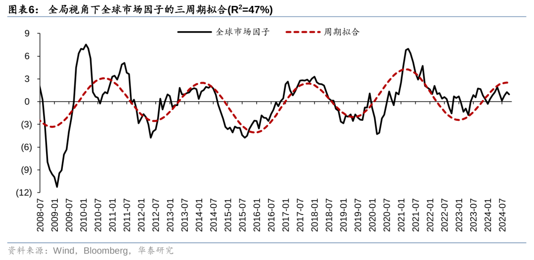 前期报告《经济周期实证、理论及应用》(2024-01-10)发现,全球主要经济体的大类资产价格和金融经济指标运行都具有显著的周期性规律,共同受到42个月基钦周期、100个月朱格拉周期、200个月库兹涅茨周期的驱动。同时,前期报告《全球资产是否存在统一的市场因子》(2023-12-31)还发现,全球主要经济体股票、商品、利率、外汇等四大类资产整体走势存在统一性。对此,我们采用主成分分析(PCA)的方法,从全球大类资产价格中提取出市场因子,然后结合傅里叶变换、高斯滤波、逆傅里叶变换等算法,对市场因子开展三周期拟合,形成经济周期模型。