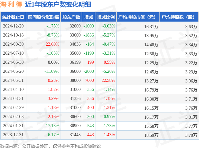 从股价来看,2024年11月29日至2024年12月20日,海 利 得区间跌幅为1.75%,在此期间股东户数减少1000.0户,减幅为3.03%。