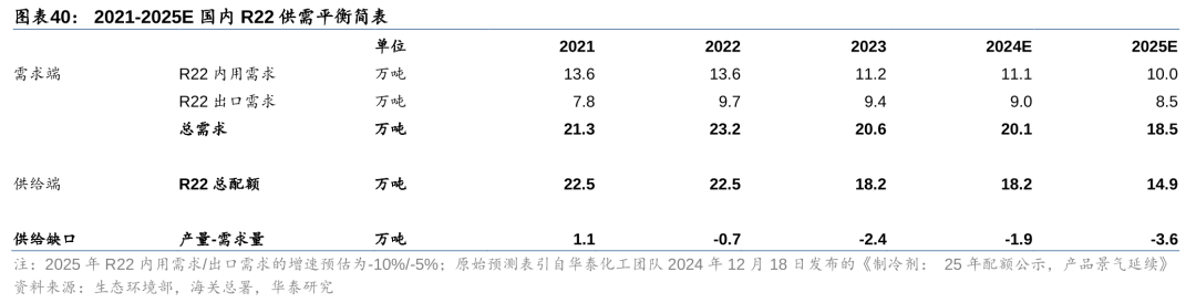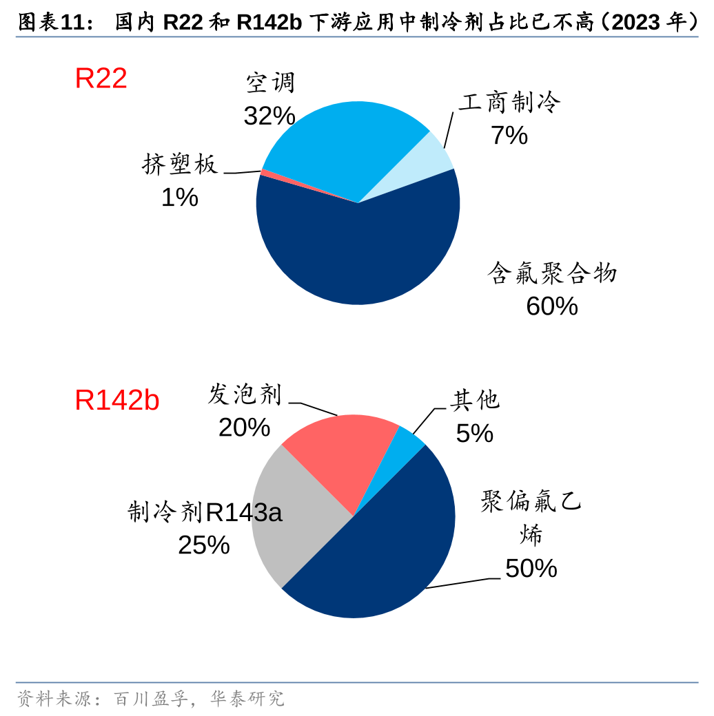 国内生态环境部2013年开始每年下发二代制冷剂的生产和使用配额,其中2025年总生产配额已削减至14.4万吨(其中R22配额14.9万吨),较2013年削减了约62%(其中R22削减约52%)。伴随HCFCs作为制冷剂使用配额的削减,近年来国内R22和R142b等主流的二代制冷剂品种开始逐渐转为下游含氟高分子和含氟精细化学品等生产的原材料(作为下游原料的HCFCs扩产不受配额的约束),据百川盈孚,2023年国内R22的下游消费占比中,用于制冷领域(空调+工商制冷)的占比仅39%,其余主要用于含氟聚合物和挤塑板等领域,R142b用于制冷剂领域的占比仅25%,其余用于PVDF和发泡剂等领域。