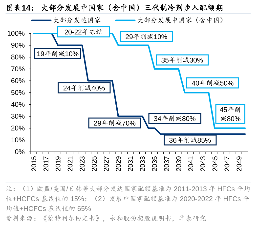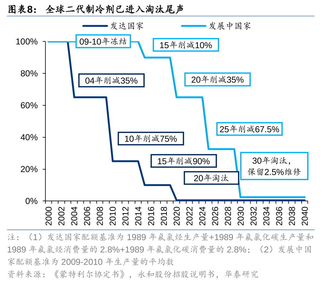 二代制冷剂(HCFCs)因对臭氧层仍有破坏作用,按照《蒙特利尔协定书》,全球作为制冷剂使用的HCFCs已进入淘汰尾声,其中发达国家于2020年需削减99.5%,仅保留少量用于存量设备的维修,发展中国家(含中国)的HCFCs配额需于2015年和2020年分别削减10%和35%,同时2025年将削减67.5%,2030年基本淘汰,仅保留2.5%用于存量设备的维修。
