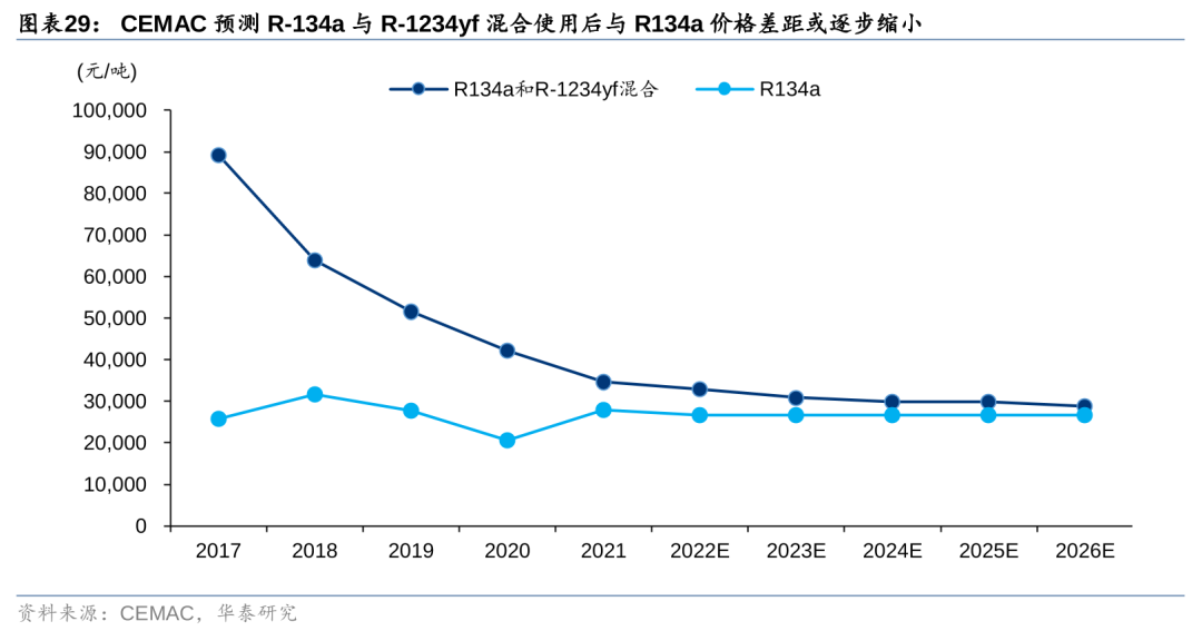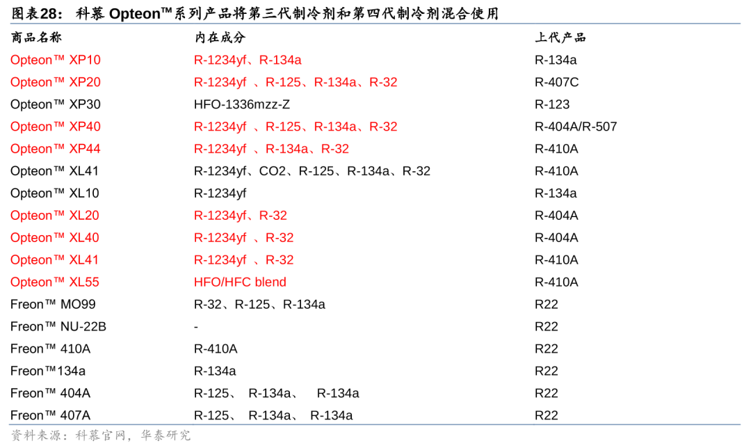 另一方面,虽HFOs产品价格较高,但由于HFCs和HFOs的分子结构相容性较强,近年来海外企业如霍尼韦尔和科慕等亦尝试推广三、四代制冷剂混配使用的方案,混配产品既可降低GWP值,也可兼顾经济性。