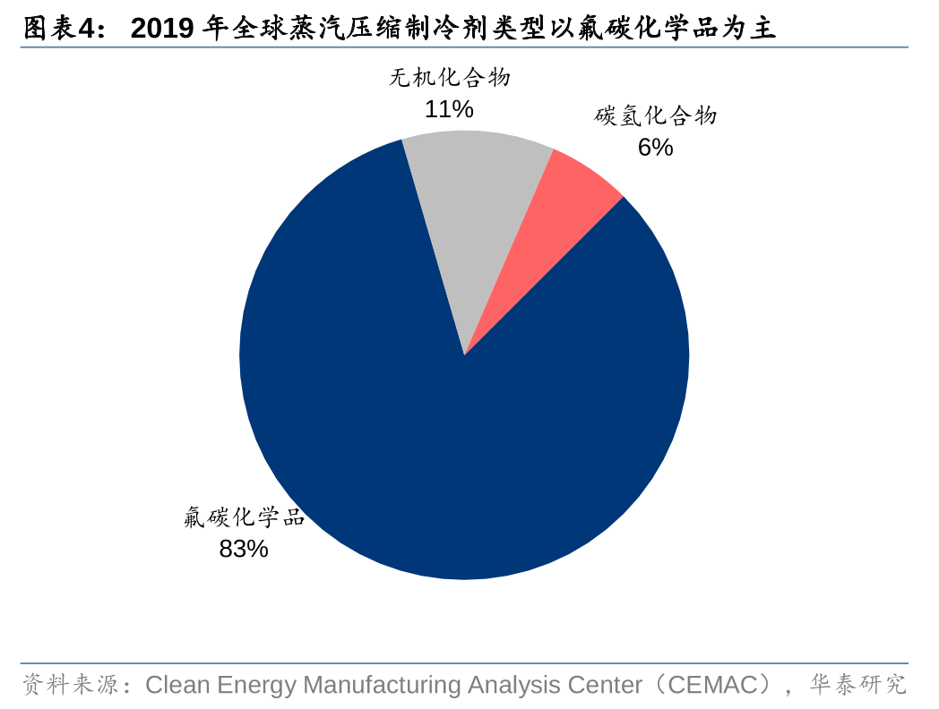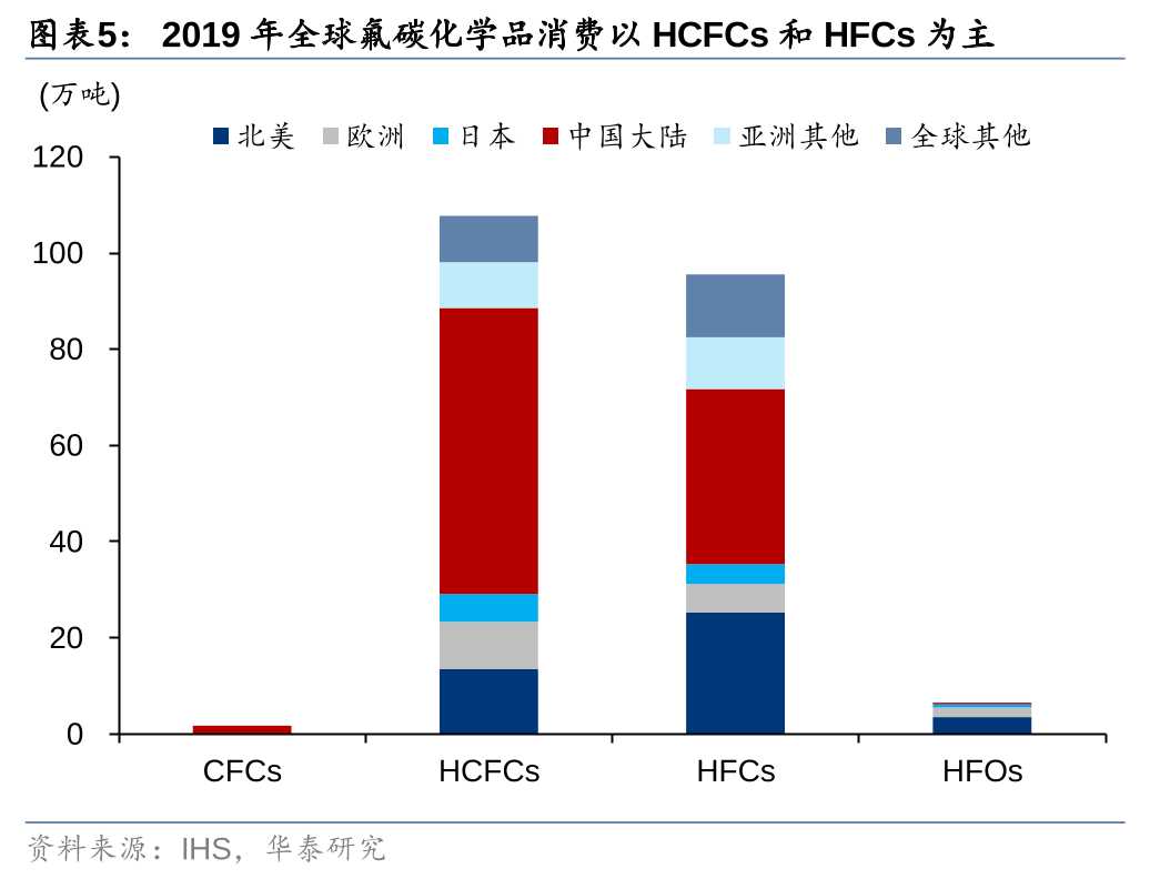 据IHS,2019年全球HCFCs消费量约108万吨,其中以中国大陆为主(占比约55%),伴随全球HCFCs排放配额削减,多数国家(包括国内)HCFCs消费转用做下游含氟高分子材料等原料为主的居多;2019年全球HFCs消费量约96万吨,其中北美和中国大陆占比分别约26%/38%。从制冷剂具体应用领域和品种来看,据CEMAC,目前空调领域主要品种为R32、R125、R134a以及R410a(系R32和R125约1:1混合)等三代制冷剂;车用空调制冷剂领域以R134a为主,同时R1234yf等四代制冷剂在部分发达国家开始应用;冰箱制冷和工商制冷等领域也普遍使用R134a和R32等单质或R404a等三代制冷剂。