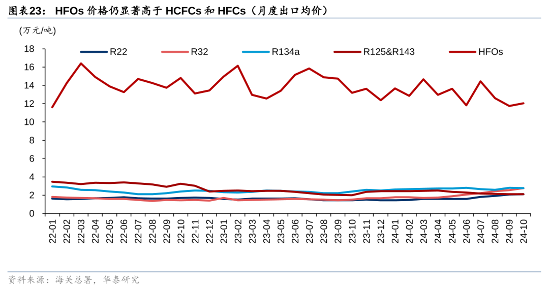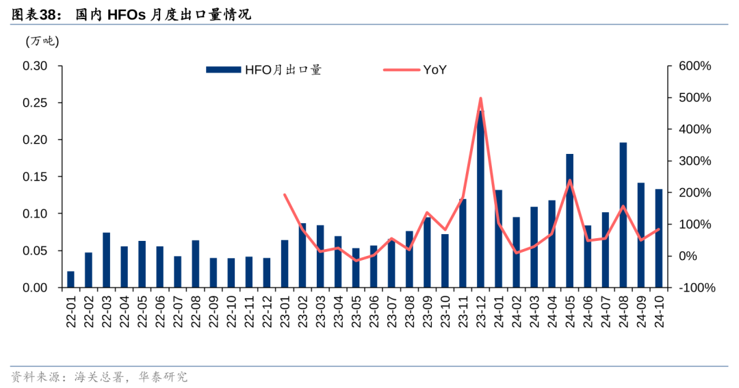 然而,虽然目前四代制冷剂主流技术集中在霍尼韦尔、科慕、阿科玛、大金和旭硝子等欧美或日本企业,但近年多家国内企业通过技术引进或者自主研发,部分企业已初步具备HFOs的早期技术和产能。未来伴随海外专利技术保护期到期,叠加国内企业不断突破规模化技术和推动成本下降,我们认为HFOs产品的应用有望逐步增长,据海关总署数据,2022年以来国内HFOs出口量整体已呈现增长态势。