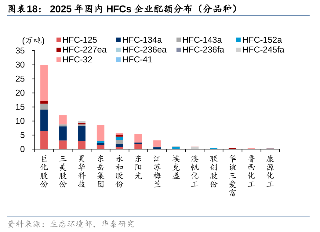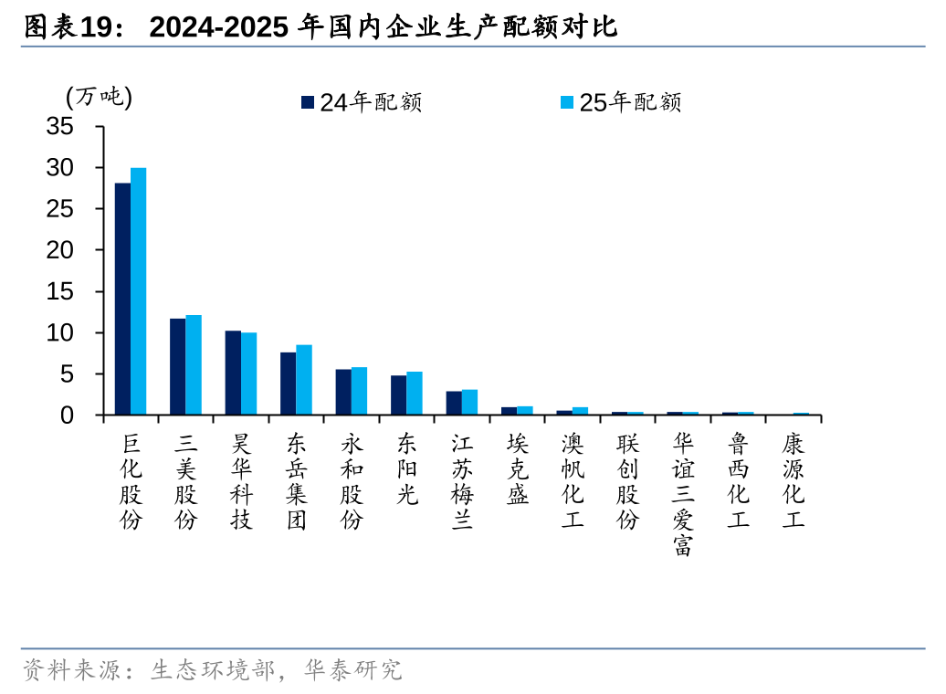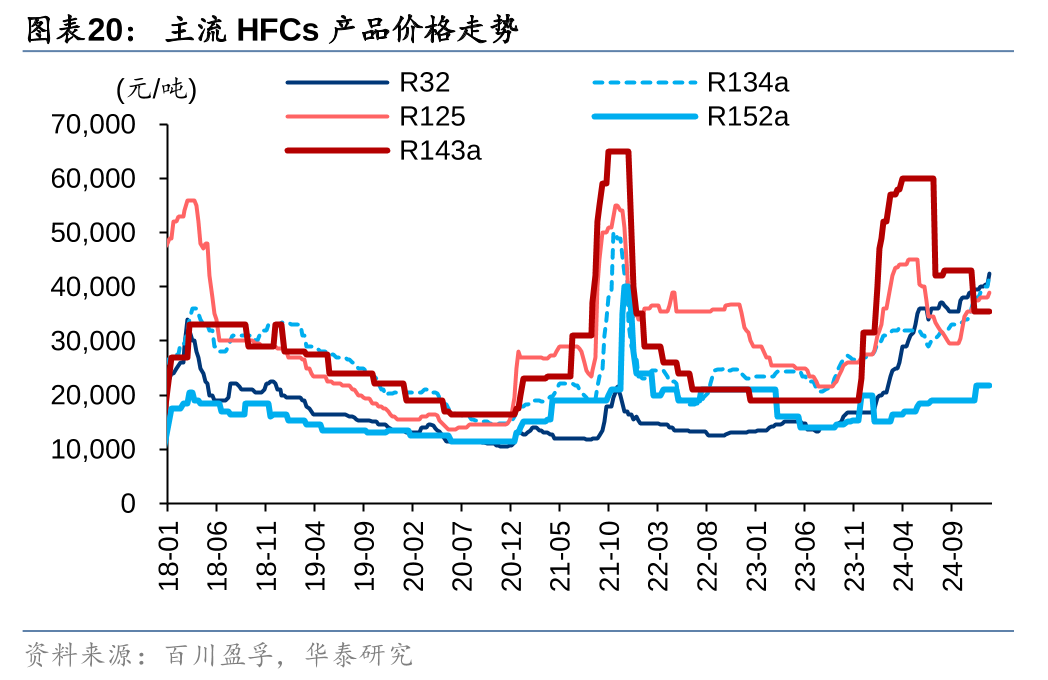 阶段性而言,HCFCs/HFCs仍是主流的制冷剂品种(尤其HFCs),而我国作为HFCs主要供给力量,伴随2024年以来配额制的正式实施,供给有序化叠加下游空调、冰箱和汽车等需求支撑,行业步入景气周期。