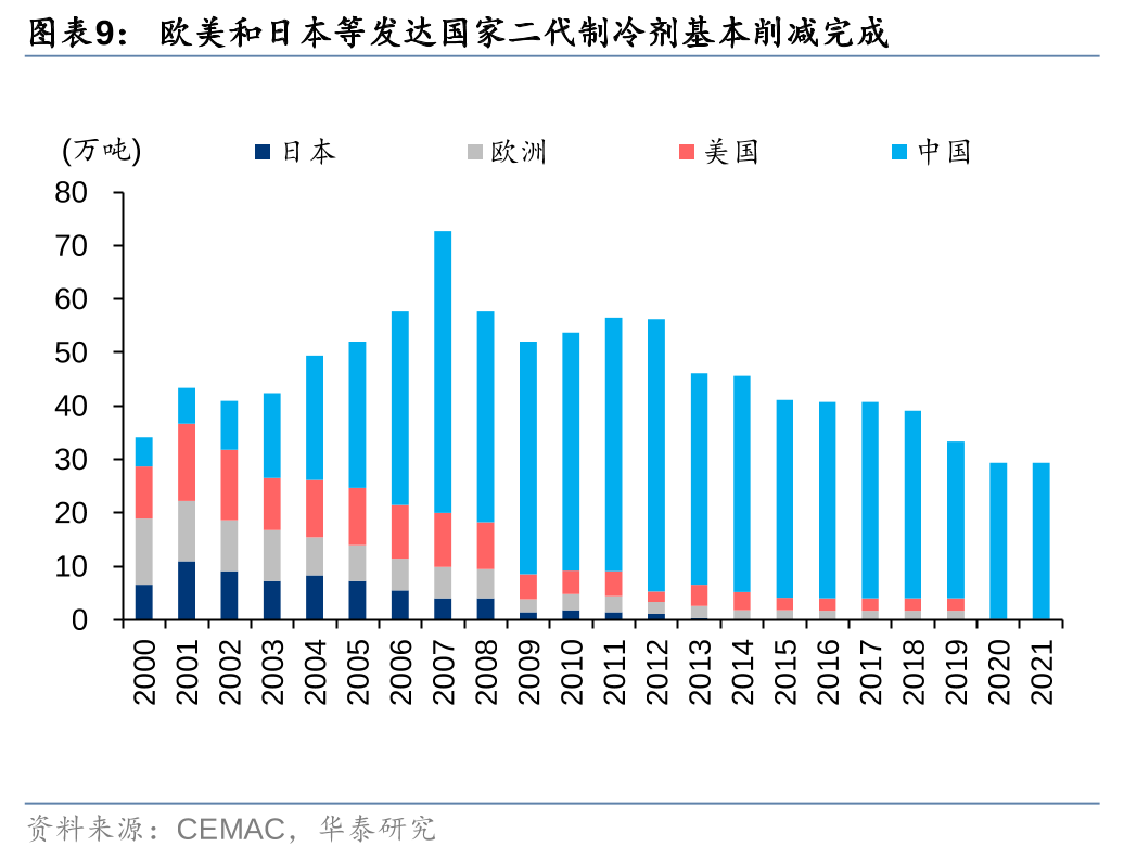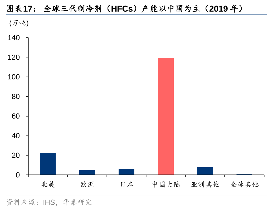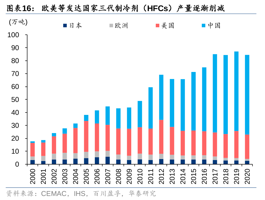 据CEMAC、IHS和百川盈孚,近年来欧洲、美国和日本HFCs产量已逐年削减,2020年合计较2012年减少约33%,国内方面,由于制冷剂企业为在基线年来临之前争取更多配额,行业扩产较多,2020年国内产量约62万吨,较2012年增长约77%。据IHS,2019年中国大陆HFCs产能约119万吨,占全球比重达74%,考虑欧美和日本等大部分发达国家2024年再度削减HFCs的生产和消费,中国HFCs成为全球HFCs供给的主导变量。