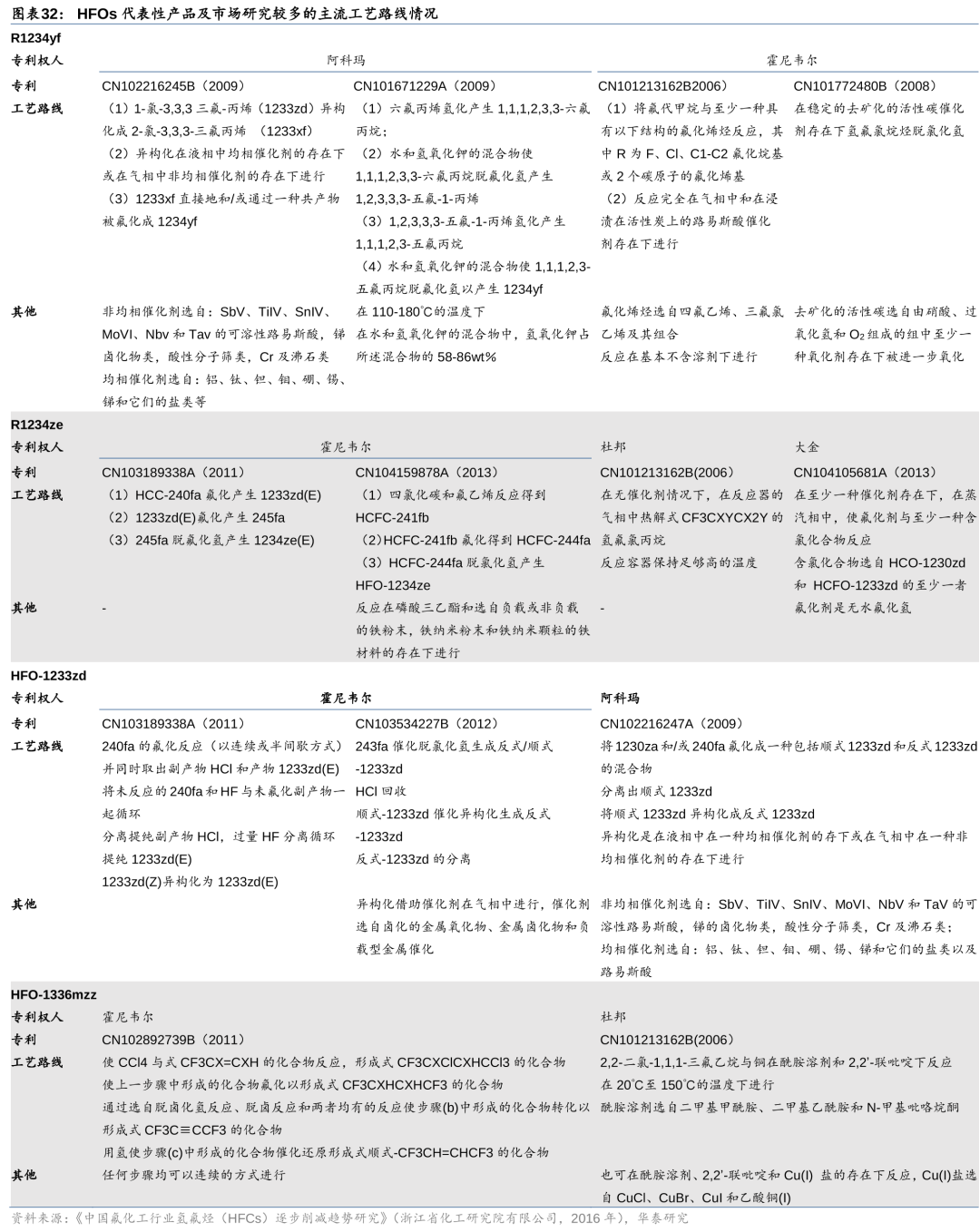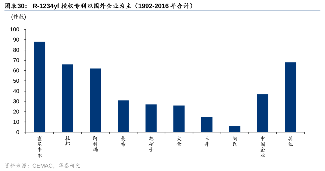 由于海外巨头企业在HFOs领域布局早于国内,目前全球主流开发和推广的HFOs产品(如R1234yf、R1234ze、R1233zd等)专利仍由海外企业为主,据CEMAC,以R1234yf为例,1992-2016年期间全球R1234yf专利集中在霍尼韦尔、杜邦和阿科玛等企业,中国企业占比仅约9%,而海外巨头企业对生产和应用专利的保护期限制,也成为行业企业布局HFOs难以避开的环节。