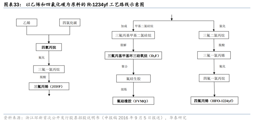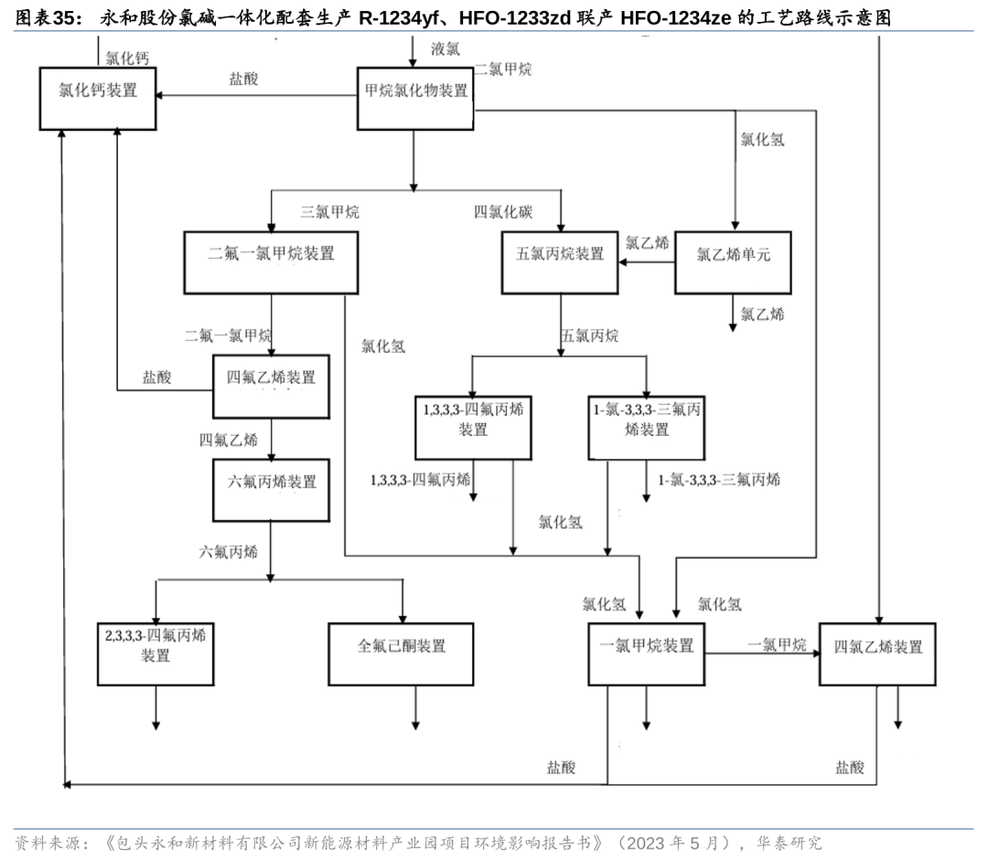 另据永和股份《包头永和新材料有限公司新能源材料产业园项目环境影响报告书》(2023年5月),公司规划依托40万吨/年废盐综合利用、18万吨/年一氯甲烷、24万吨/年甲烷氯化物等项目,配套建设12万吨/年 R22、4.8万吨/年HFP(六氟丙烯)、2万吨/年 HFO-1234yf、2.3万吨/年HFO-1233zd联产HFO-1234ze装置等,公司采用甲烷氯化物→R22→四氟乙烯→HFP→HFO-1234yf,或乙炔→氯乙烯→五氯丙烷→HFO-1233zd联产HFO-1234ze的工艺路线,可实现四代制冷剂的工业化生产。