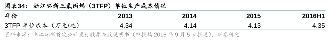 参考浙江环新乙烯和四氯化碳为原料生产三氟丙烯,再由三氟丙烯合成R1234yf的工艺流程,据其招股说明书(申报稿),公司规划新建的3000吨/年R1234yf,对应三氟丙烯消耗约4000吨/年(即R1234yf对三氟丙烯单耗约1.33t/t),而公司13-16H1三氟丙烯单位生产成本在4-4.5万元/吨,由此可见生产R1234yf仅原料三氟丙烯的单吨成本即在5万元/吨以上,考虑其他材料的消耗及加工费用等,R1234yf的单位生产成本则更高。