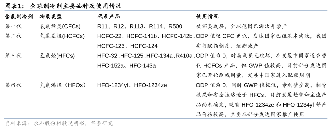 制冷剂经过多年发展,目前已有四代产品,其中:一代为氯氟烃(CFCs),因严重破坏臭氧层,全球已淘汰并禁止;二代为氢氯氟烃(HCFCs),主要为HCFC-22和HCFC-142b等,其消耗臭氧潜能值(ODP)较CFCs低,但仍对臭氧层存在破坏效应,发达国家已基本淘汰完毕,国内目前实行配额制逐渐减产并进入淘汰末期;三代为氢氟烃(HFCs),主要品种为HFC-32、HFC-134a、R125及混配制剂R410a等(注:HCFC-和HFC-均可简称R,全文同此处理),HFCs的ODP为0,是目前主流的制冷剂,但全球变暖潜能值(GWP)较高,部分发达国家已开始削减,国内2024年正式进入配额期;四代为氢氟烯烃(HFOs),ODP为0且GWP较低,但受限于技术和价格等,目前仅部分发达国家推广,主流产品尚未确定。