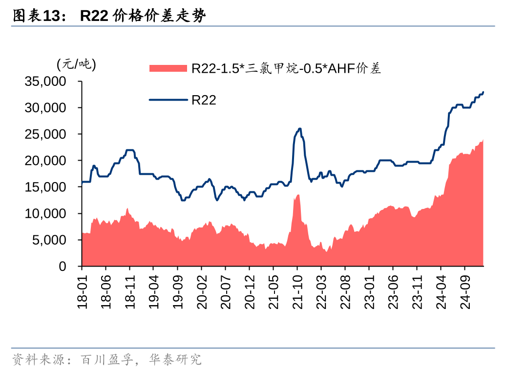 R22作为HCFCs中的主要产品,相较2024年,2025年国内企业生产/内用生产配额将分别削减3.3/3.1万吨至14.9/8.1万吨,其中R22企业生产配额CR3/CR5为76%/87%,东岳集团/巨化股份/江苏梅兰拥有配额4.4/3.9/3.1万吨,占比29%/26%/21%。由于近年来R22配额削减的同时,需求端出口和国内维修市场体量仍较大,叠加产品集中度较高、竞争格局优异,2024年以来R22价格持续攀升,24Q4整体处于3万元/吨以上的历史高价区间。