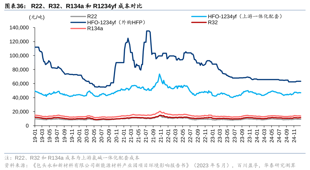考虑海外HFOs首批专利到期时间需在2026-2035年,且考虑技术成熟度等因素,未来企业实际规模化生产HFOs的初期成本或将高于我们的估算值,我们认为HFOs降本和规模化应用尚需时日。因此当前主流的HCFCs/HFCs由于配额制下供给约束、叠加空调/汽车等需求支撑,景气周期有望较长,且考虑作为替代品的HFOs成本和价格较高,我们预计HCFCs/HFCs将具备较大的涨价弹性空间,预计25-26年主流产品(R22/R32/R134a等)均价约4.5万元/吨和5万元/吨。