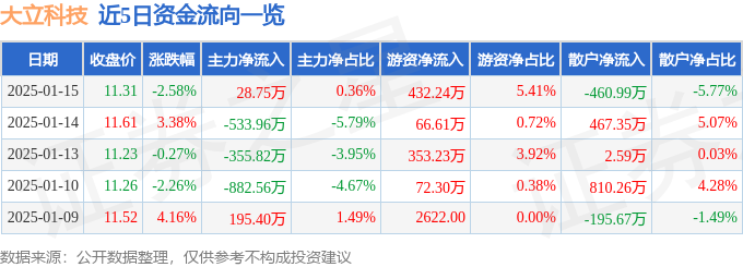 证券之星消息,截至2025年1月15日收盘,大立科技(002214)报收于11.31元,下跌2.58%,换手率1.47%,成交量7.05万手,成交额7993.59万元。
