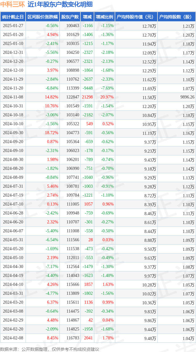 从股价来看,2025年1月20日至2025年1月27日,中科三环区间跌幅为0.56%,在此期间股东户数减少1166.0户,减幅为1.15%。