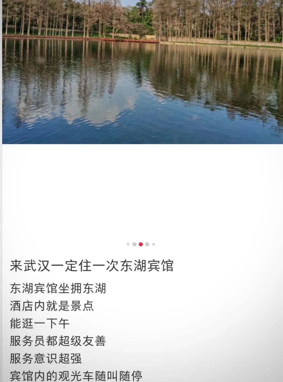 比如东湖宾馆直接躺在酒店就能观景,还向游客提供泛舟品茗等buff。