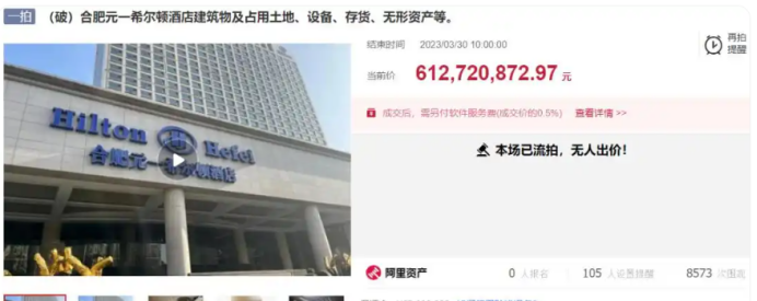2023年3月,合肥一希尔顿酒店建筑物以6.13亿元的价格起拍,最终因无人出价而流拍。