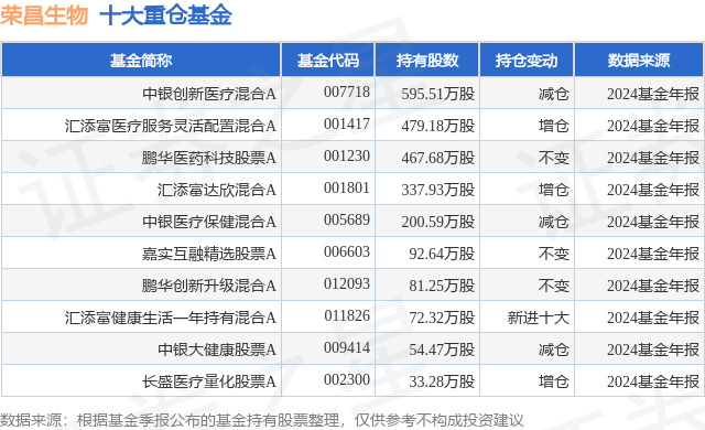根据2024基金年报公募基金重仓股数据,重仓该股的公募基金共14家,其中持有数量最多的公募基金为中银创新医疗混合A。中银创新医疗混合A目前规模为20.2亿元,最新净值1.2152(2月7日),较上一交易日上涨0.02%,近一年上涨9.7%。该公募基金现任基金经理为郑宁。郑宁在任的基金产品包括:中银医疗保健混合A,管理时间为2022年10月13日至今,期间收益率为3.57%;中银大健康股票A,管理时间为2023年2月28日至今,期间收益率为-9.9%;中银港股通医药混合发起A,管理时间为2023年12月29日至今,期间收益率为-9.34%。