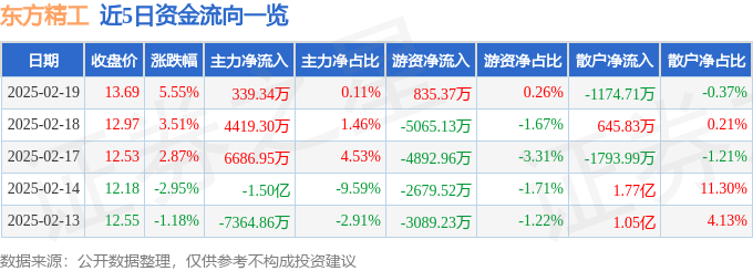证券之星消息,截至2025年2月19日收盘,东方精工(002611)报收于13.69元,上涨5.55%,换手率23.3%,成交量233.49万手,成交额31.55亿元。