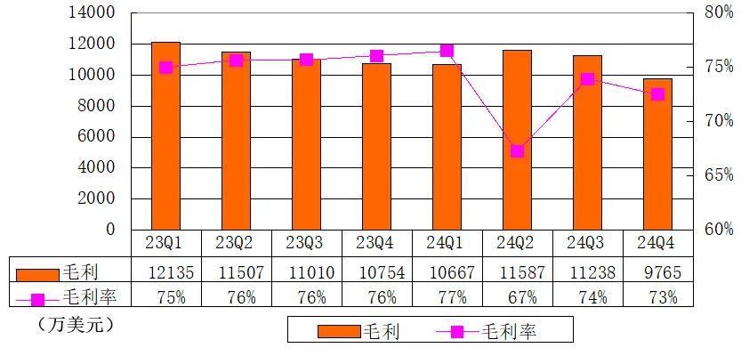 搜狐2024年第四季度毛利为9765万美元,毛利率为73%。