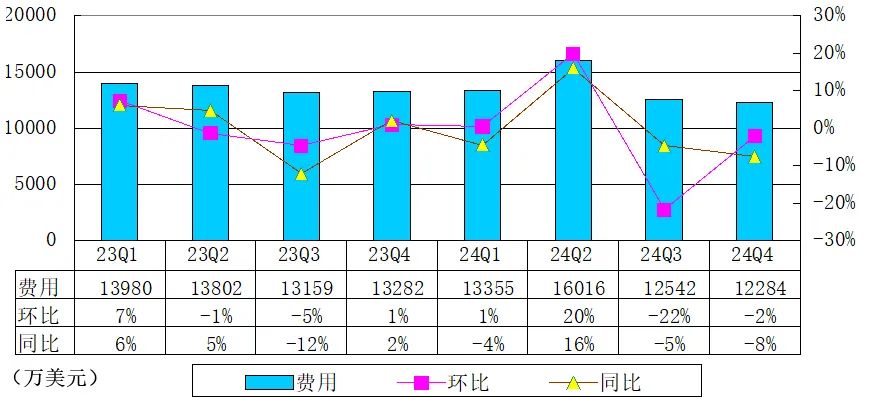 搜狐2024年第四季度费用为1.23亿美元,较上年同期的1.33亿美元下降8%,较上一季度下降2%。同比下降主要由于畅游产品研发费用减少。