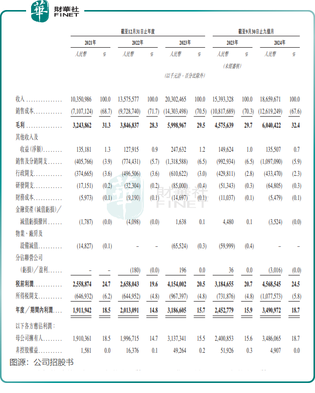 2021年-2023年及2024年前九个月,蜜雪冰城实现营收分别为103.51亿元、135.76亿元、203.02亿及186.6亿元。同期,期内利润分别为19.12亿元、20.13亿元、31.87亿元及34.91亿元。