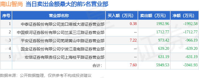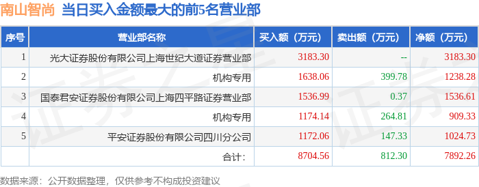 证券之星消息,沪深交易所2025年2月24日公布的交易公开信息显示,南山智尚(300918)因日涨幅达到15%的前5只证券登上龙虎榜。此次是近5个交易日内第2次上榜。