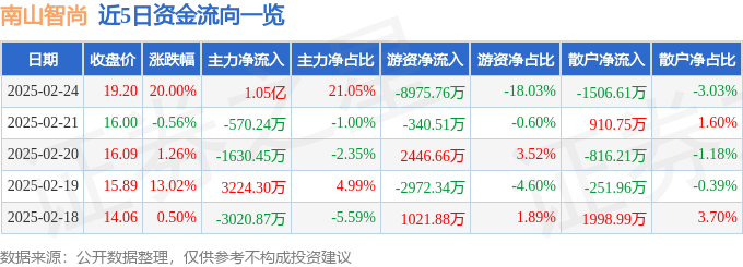证券之星消息,南山智尚2月24日涨停收盘,收盘价19.2元。该股于9点38分涨停,未打开涨停,截止收盘封单资金为1.01亿元,占其流通市值1.38%。