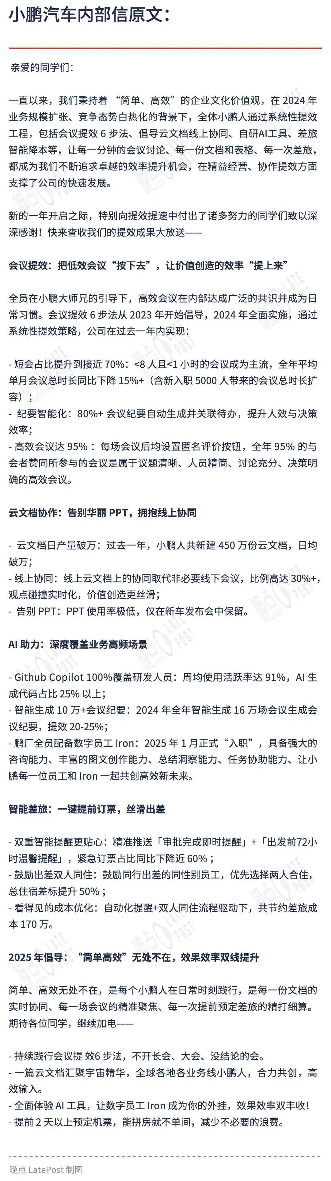 小鹏汽车在内部信中总结道,2024 年 8 人以内、低于 1 小时的会议占比超过 70%,30% 的线下会议取消,转成线上用飞书云文档协同。