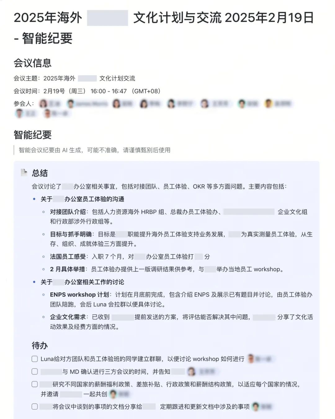 小鹏汽车一场会议后, AI 会议纪要生成了总结和待办。