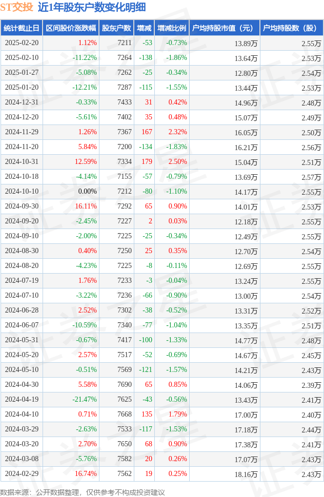 从股价来看,2025年2月10日至2025年2月20日,ST交投区间涨幅为1.12%,在此期间股东户数减少53.0户,减幅为0.73%。