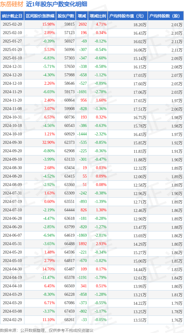 从股价来看,2025年2月10日至2025年2月20日,东岳硅材区间涨幅为15.98%,在此期间股东户数增加2692.0户,增幅为4.71%。