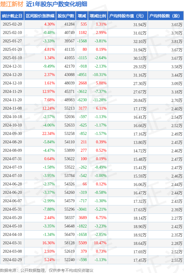 从股价来看,2025年2月10日至2025年2月20日,楚江新材区间涨幅为4.3%,在此期间股东户数增加535.0户,增幅为1.31%。