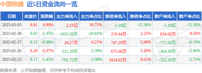 证券之星消息,中国核建3月3日涨停收盘,收盘价8.81元。该股于10点41分涨停,未打开涨停,截止收盘封单资金为5425.01万元,占其流通市值0.2%。