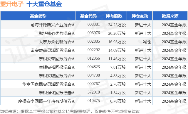 重仓盟升电子的前十大公募基金请见下表: