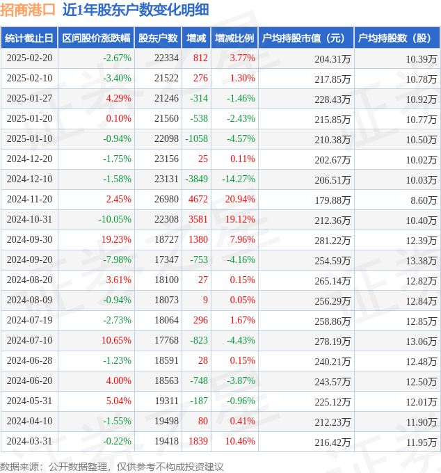 从股价来看,2025年2月10日至2025年2月20日,招商港口区间跌幅为2.67%,在此期间股东户数增加812.0户,增幅为3.77%。
