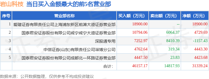 证券之星消息,沪深交易所2025年3月6日公布的交易公开信息显示,岩山科技(002195)因日涨幅偏离值达到7%的前5只证券登上龙虎榜。此次是近5个交易日内第2次上榜。