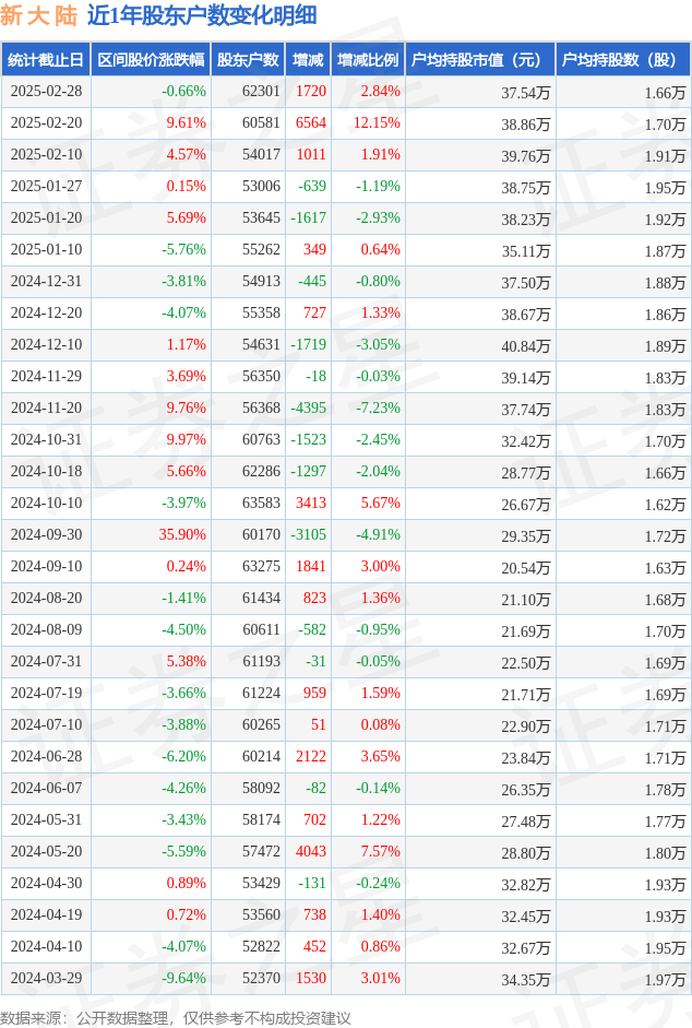 从股价来看,2025年2月20日至2025年2月28日,新 大 陆区间跌幅为0.66%,在此期间股东户数增加1720.0户,增幅为2.84%。