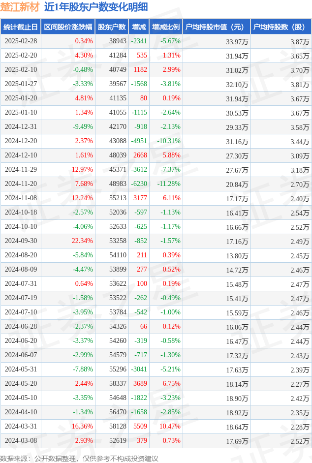 从股价来看,2025年2月20日至2025年2月28日,楚江新材区间涨幅为0.34%,在此期间股东户数减少2341.0户,减幅为5.67%。