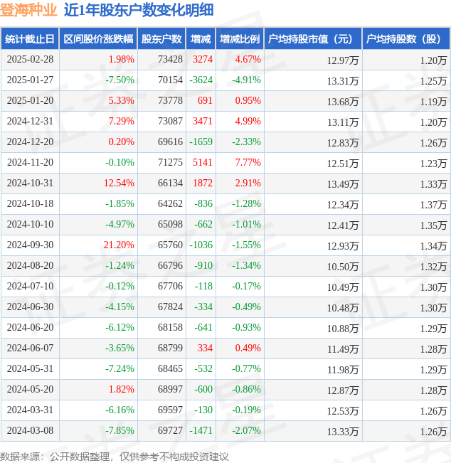 从股价来看,2025年1月27日至2025年2月28日,登海种业区间涨幅为1.98%,在此期间股东户数增加3274.0户,增幅为4.67%。