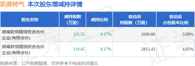 证券之星消息,3月10日凯美特气发布公告《凯美特气:关于股东及一致行动人减持计划期限届满的公告》,其股东湖南财信精信投资合伙企业(有限合伙)于2024年12月30日至2024年12月31日间合计减持235.0万股,占公司目前总股本的0.338%,变动期间该股股价下跌5.84%,截止12月31日收盘报6.13元。