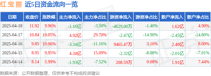 4月18日的资金流向数据方面,主力资金净流出1.16亿元,占总成交额3.5%,游资资金净流出4629.0万元,占总成交额1.4%,散户资金净流入1.62亿元,占总成交额4.9%。