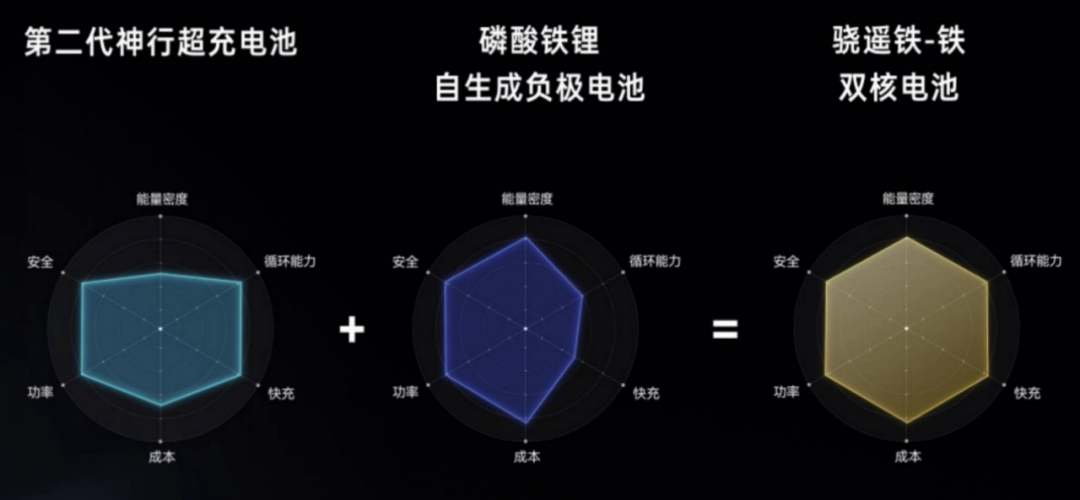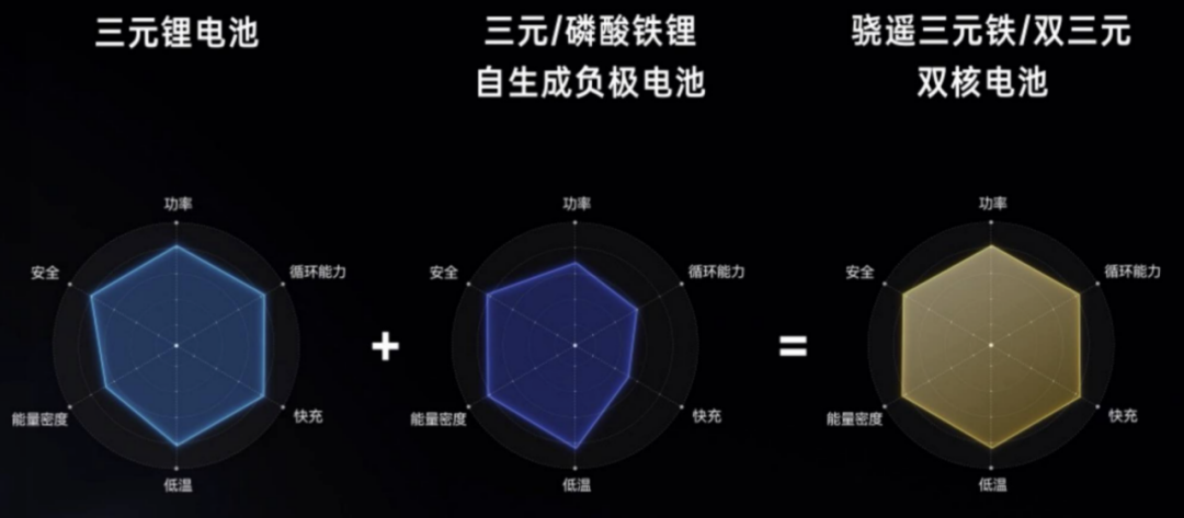 如果说“钠新电池”打破了材料本身的性能边界,拓展了动力电池的低温应用场景,夯实了新能源发展的基础;那么本次宁德时代在科技日上发布的另外一款产品“骁遥双核电池”则是做到了让全电化学体系优势互补,最大化提升全场景的应用效果。