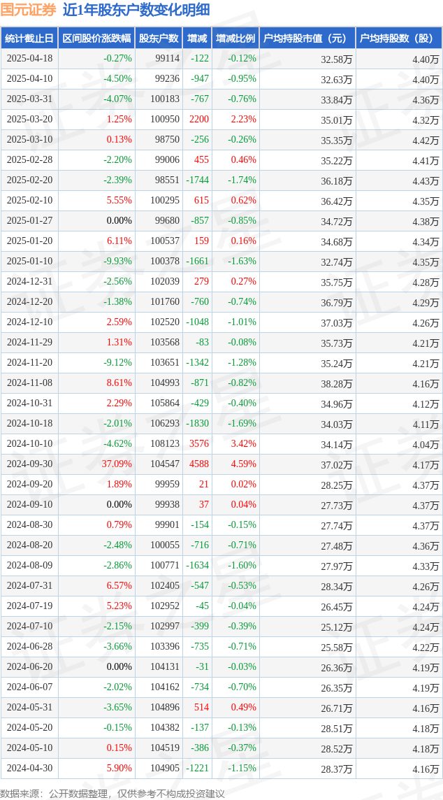 从股价来看,2025年4月10日至2025年4月18日,国元证券区间跌幅为0.27%,在此期间股东户数减少122.0户,减幅为0.12%。