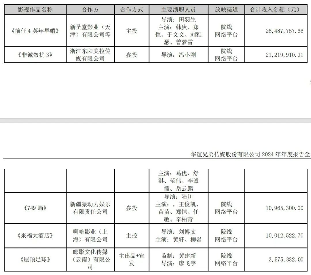 2024年,对公司营收贡献最大的前5名影视作品分别为《前任4》《非诚勿扰3》《749局》《来福大酒店》和《屋顶足球》,合计实现收入7226.08万元。