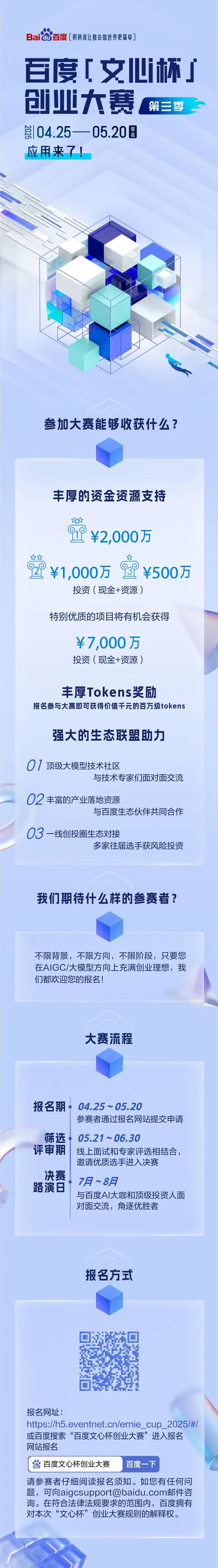 第三届“文心杯”创业大赛于4月25日正式启动,报名持续到5月20日24:00关闭。参赛人员可百度搜索“百度文心杯创业大赛”进入官网报名或直接点击下方链接。