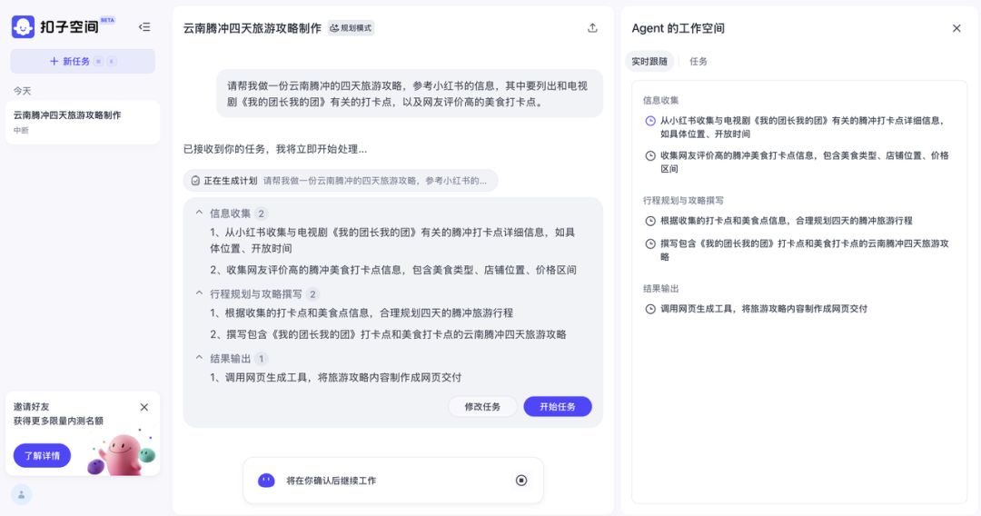 近期发布的扣子空间、心响App、纳米AI的Agent能力以及Genspark基本都遵循了这个雏形模版。扣子空间分为三个部分,左边部分是任务目录,中间部分是任务交互区,右边可以展开一个Agent的工作空间。同时,扣子空间还会支持添加扩展,以及选择探索和规划两种思考深度不同的模式。