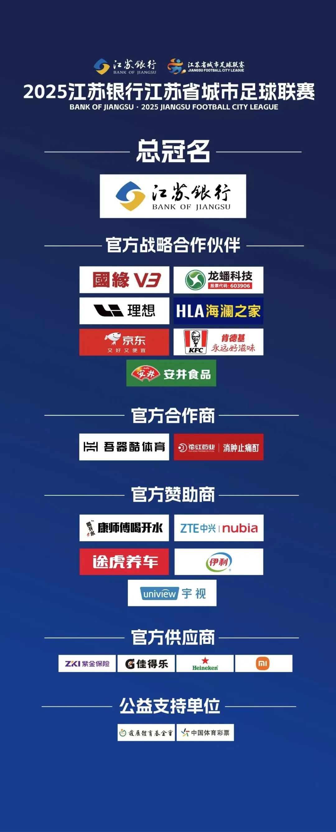 其中,总冠名为江苏银行,官方战略合作伙伴有7个——国缘V3、龙蟠科技、理想、海澜之家、京东、肯德基、安井食品;官方合作商有2个——吾器酷体育、花红药业;官方赞助商有5个——康师傅喝开水、中兴、途虎养车、伊利、宇视;官方供应商有4个——紫金保险、佳得乐、喜力、小米。